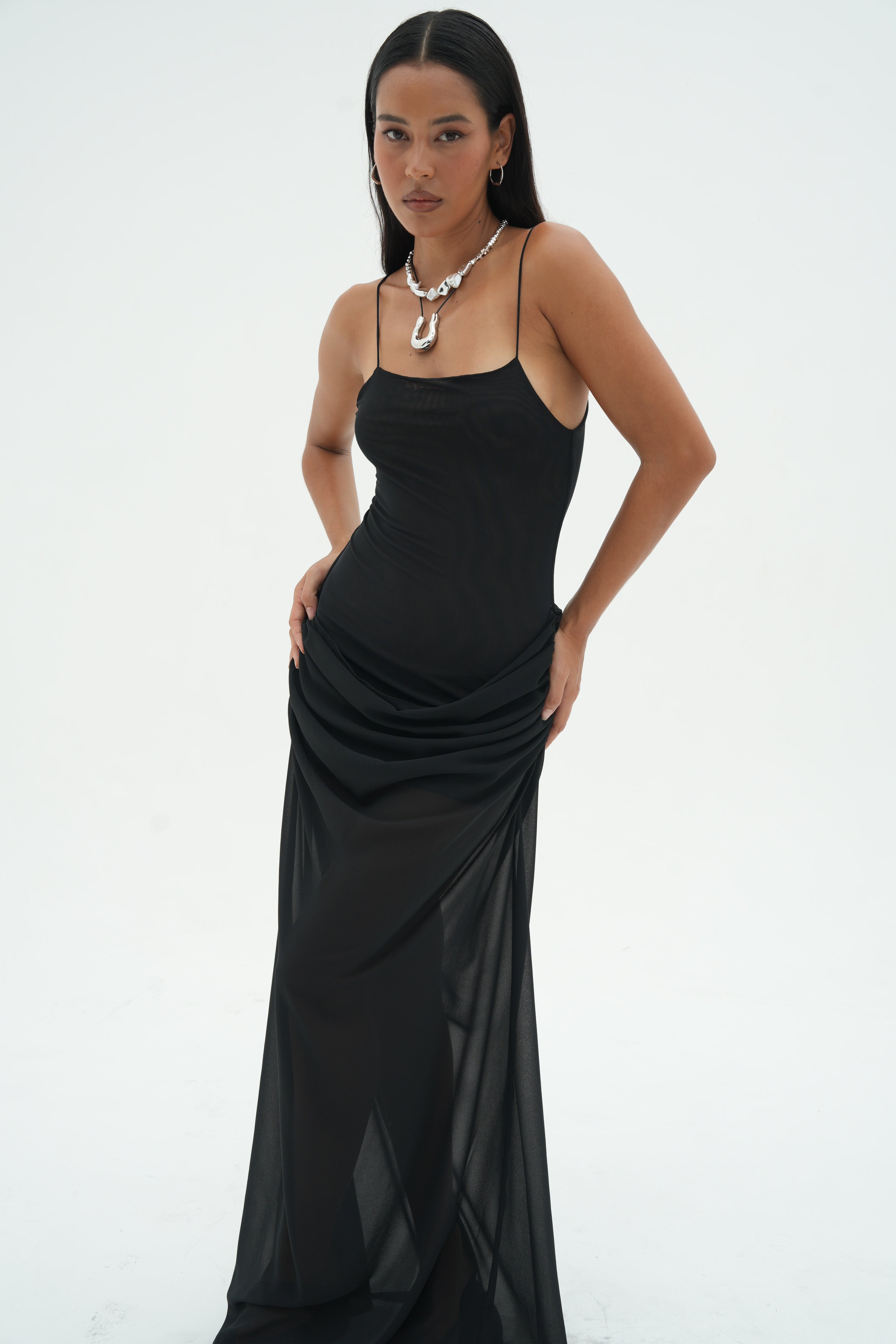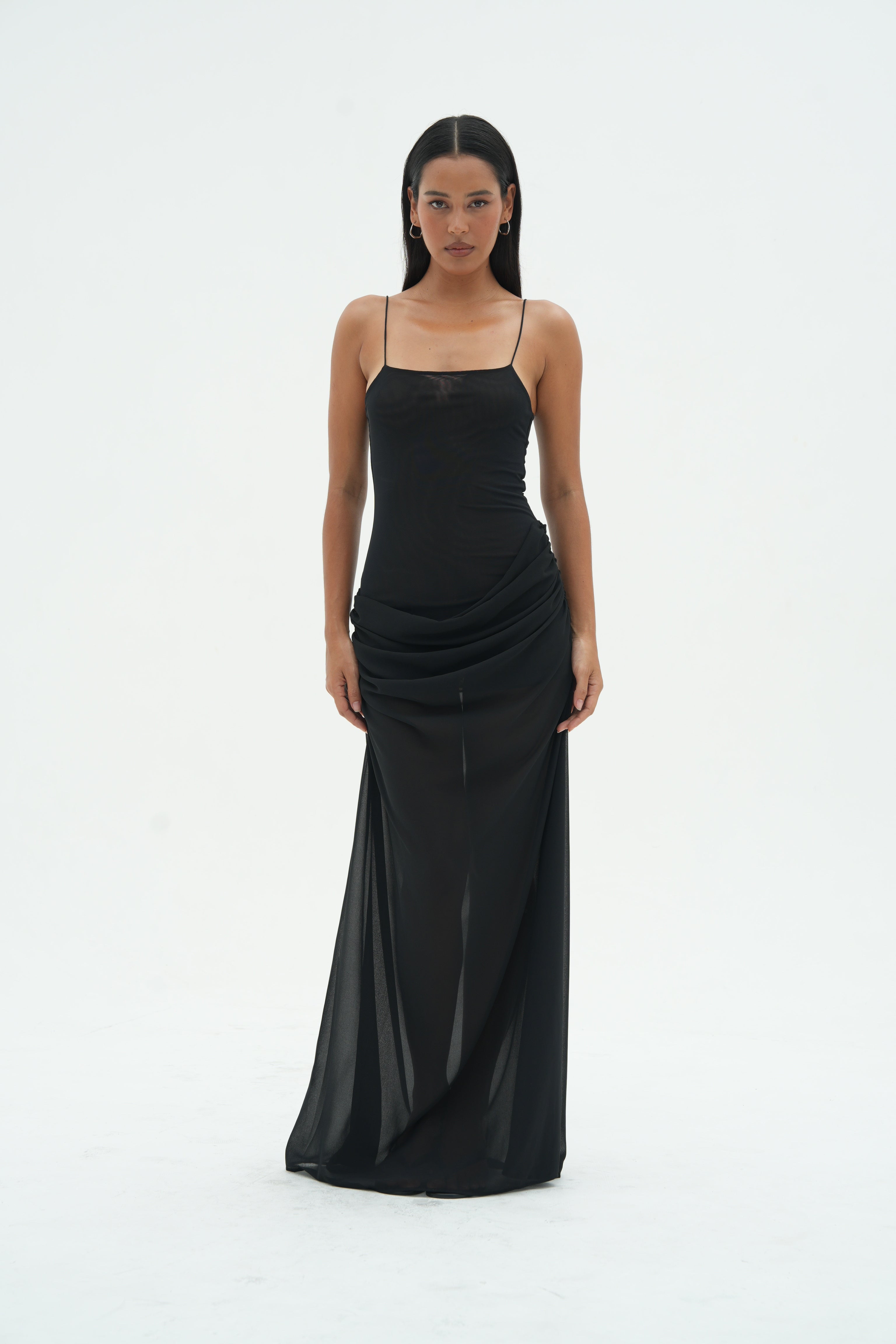 A double mesh bodice, with delicate spaghetti straps.