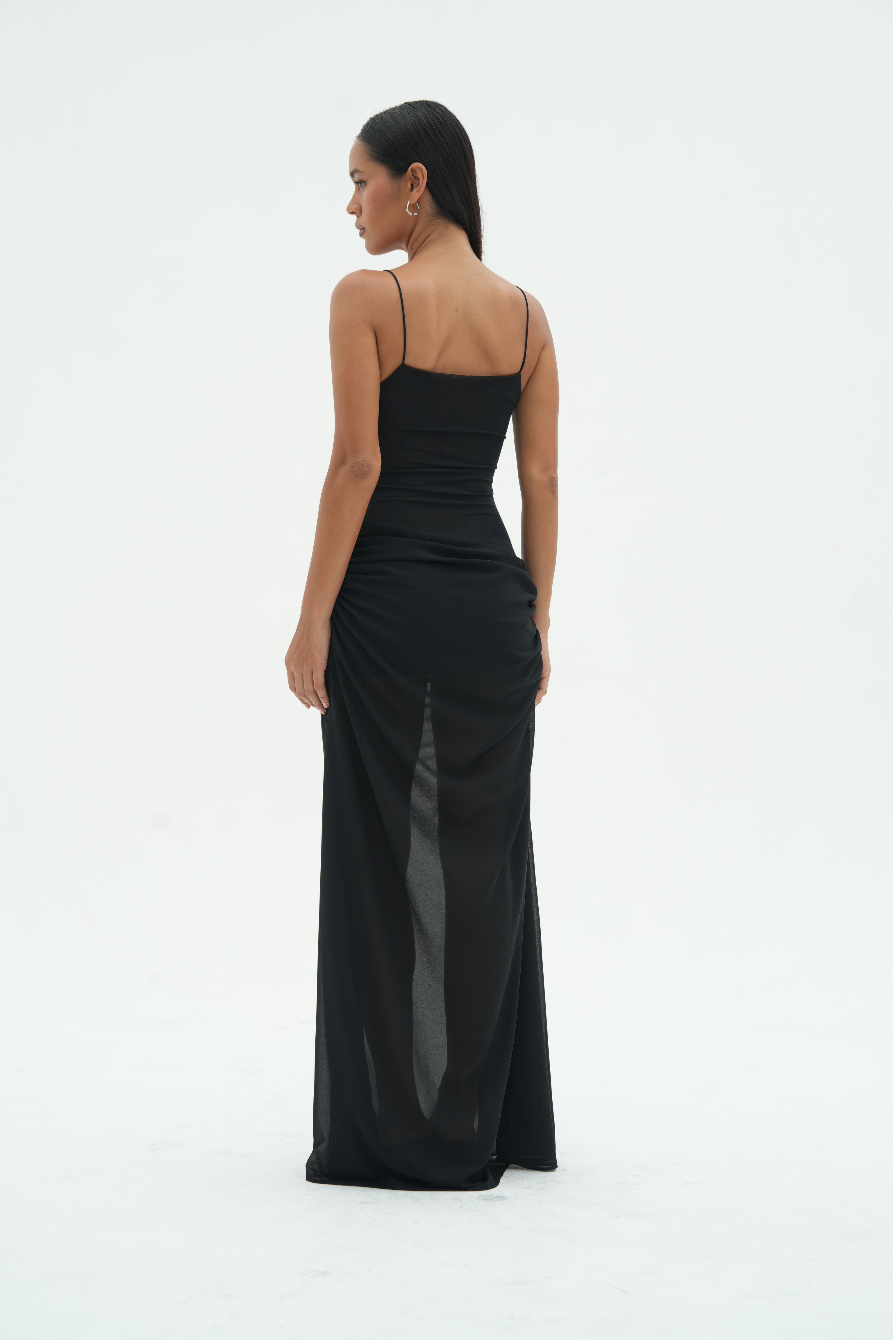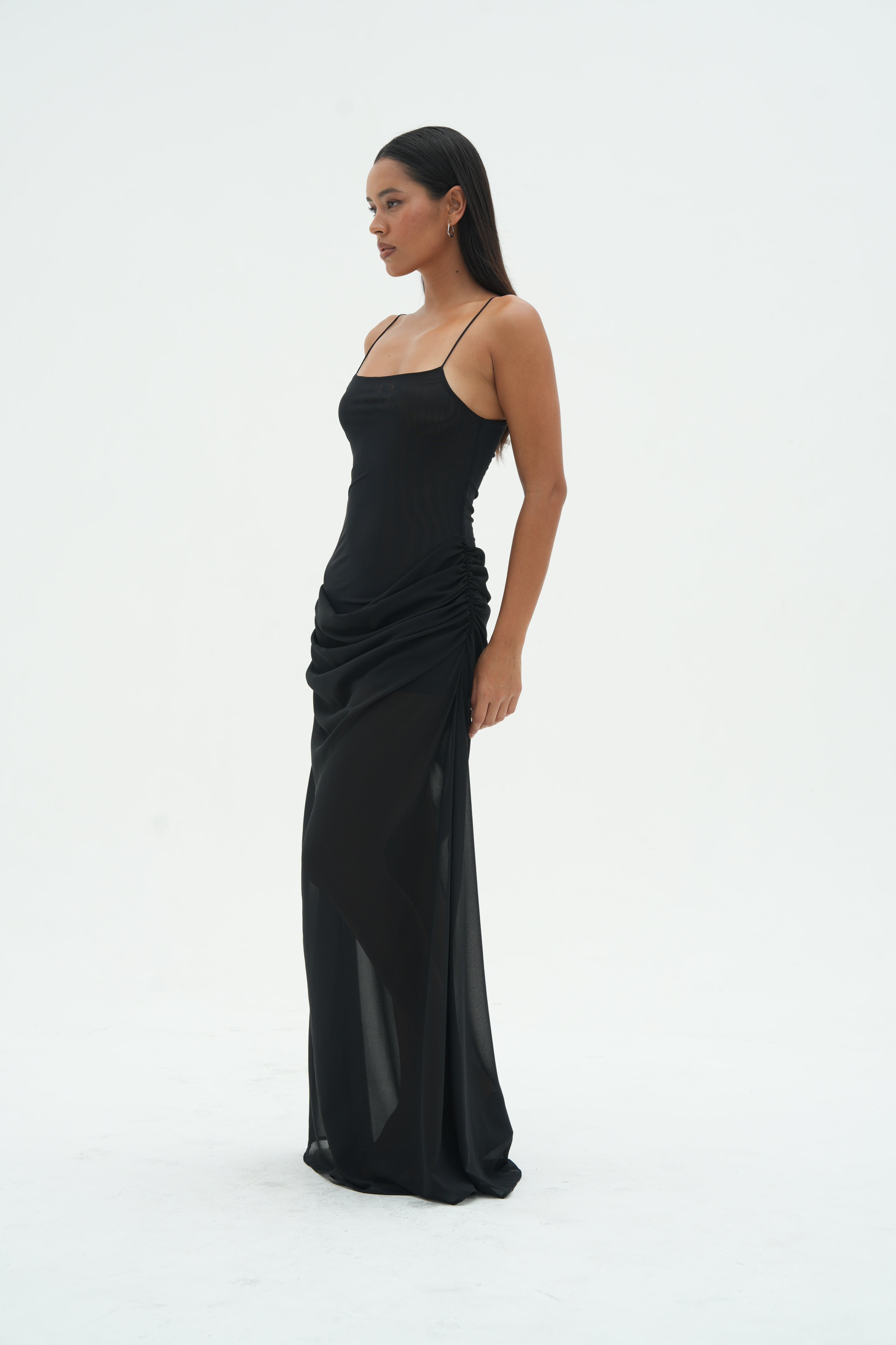 Cascading into an asymmetrical draped lower body, this dress softy skims the body allowing for a soft feminine silhouette, crafted from lightweight chiffon.