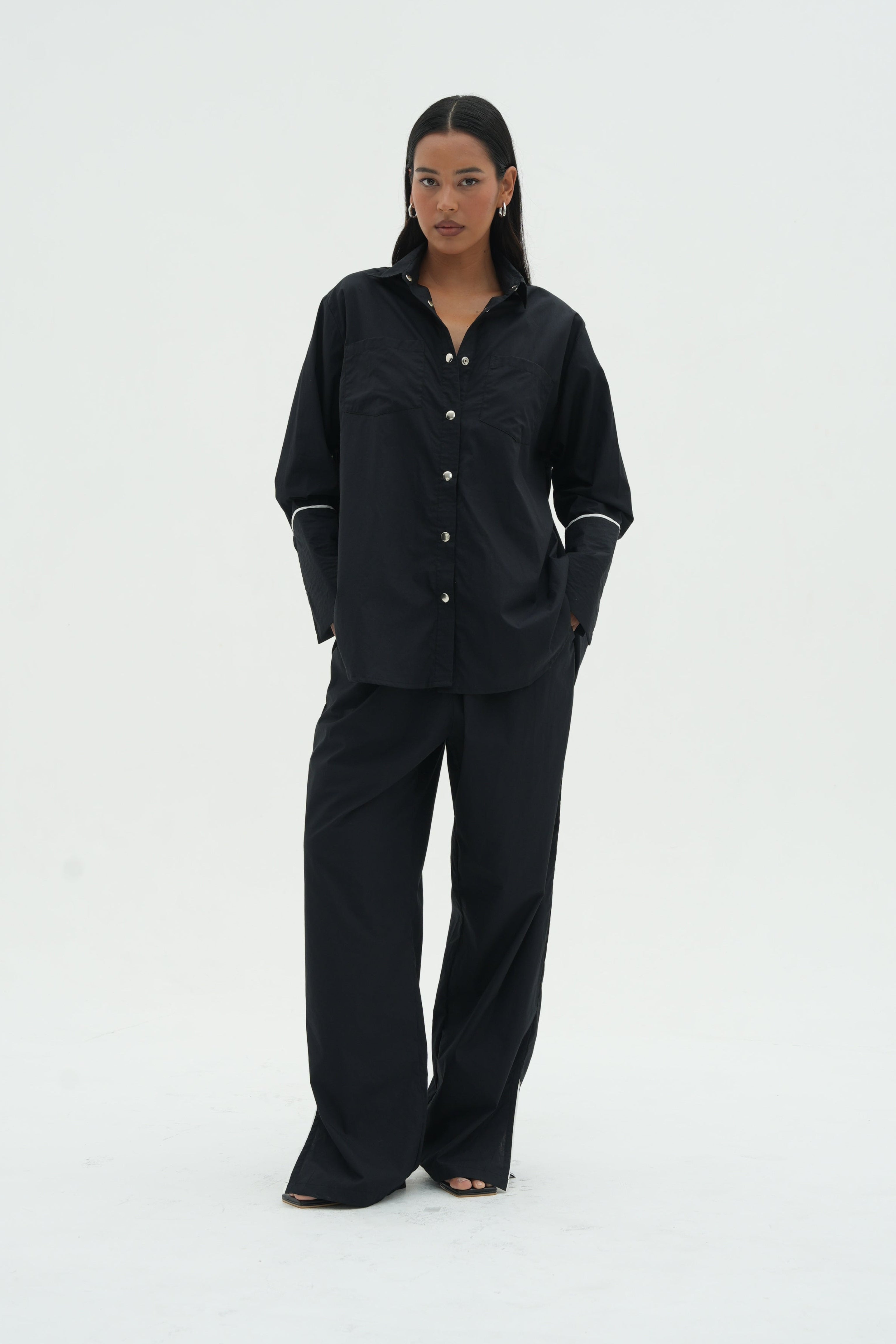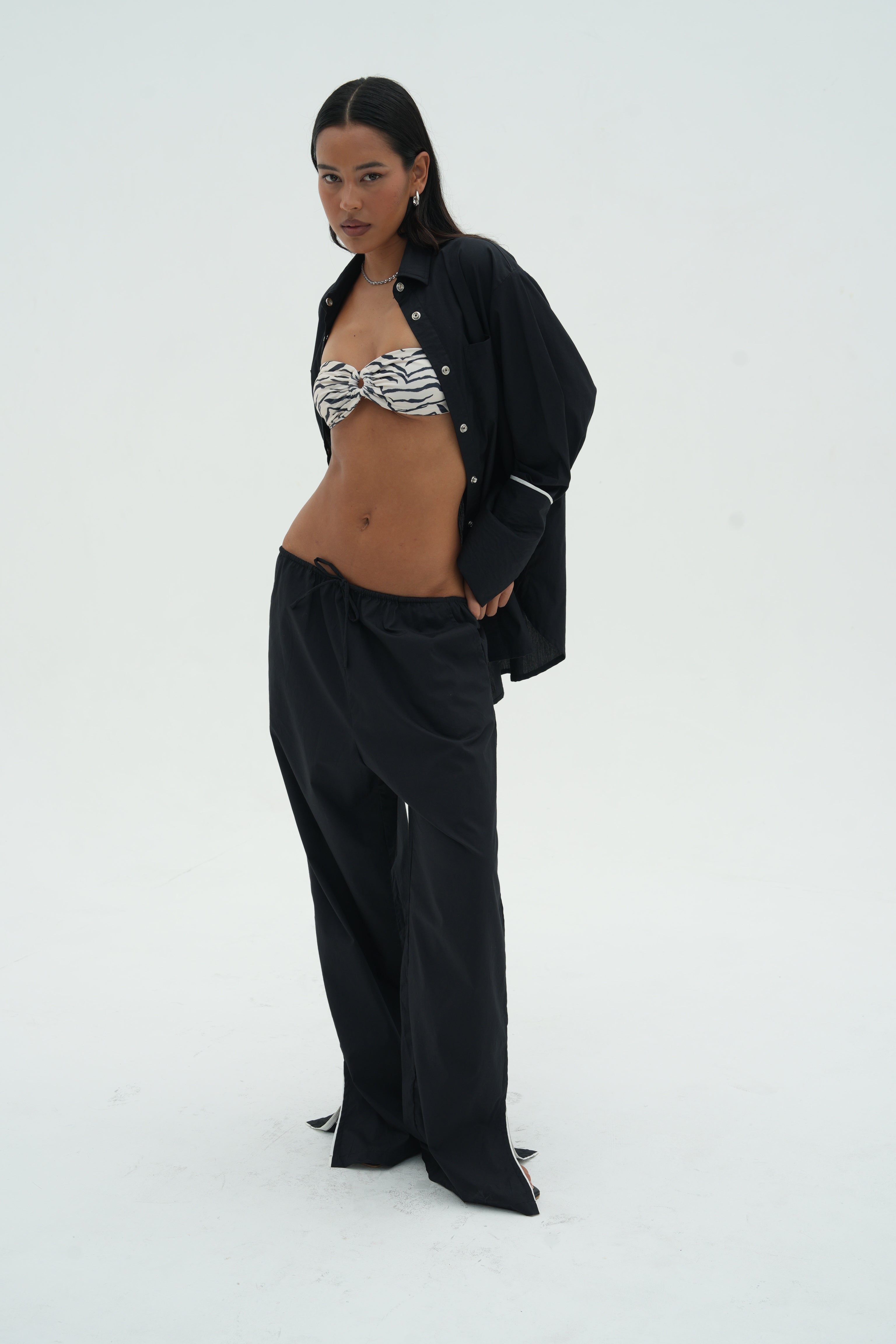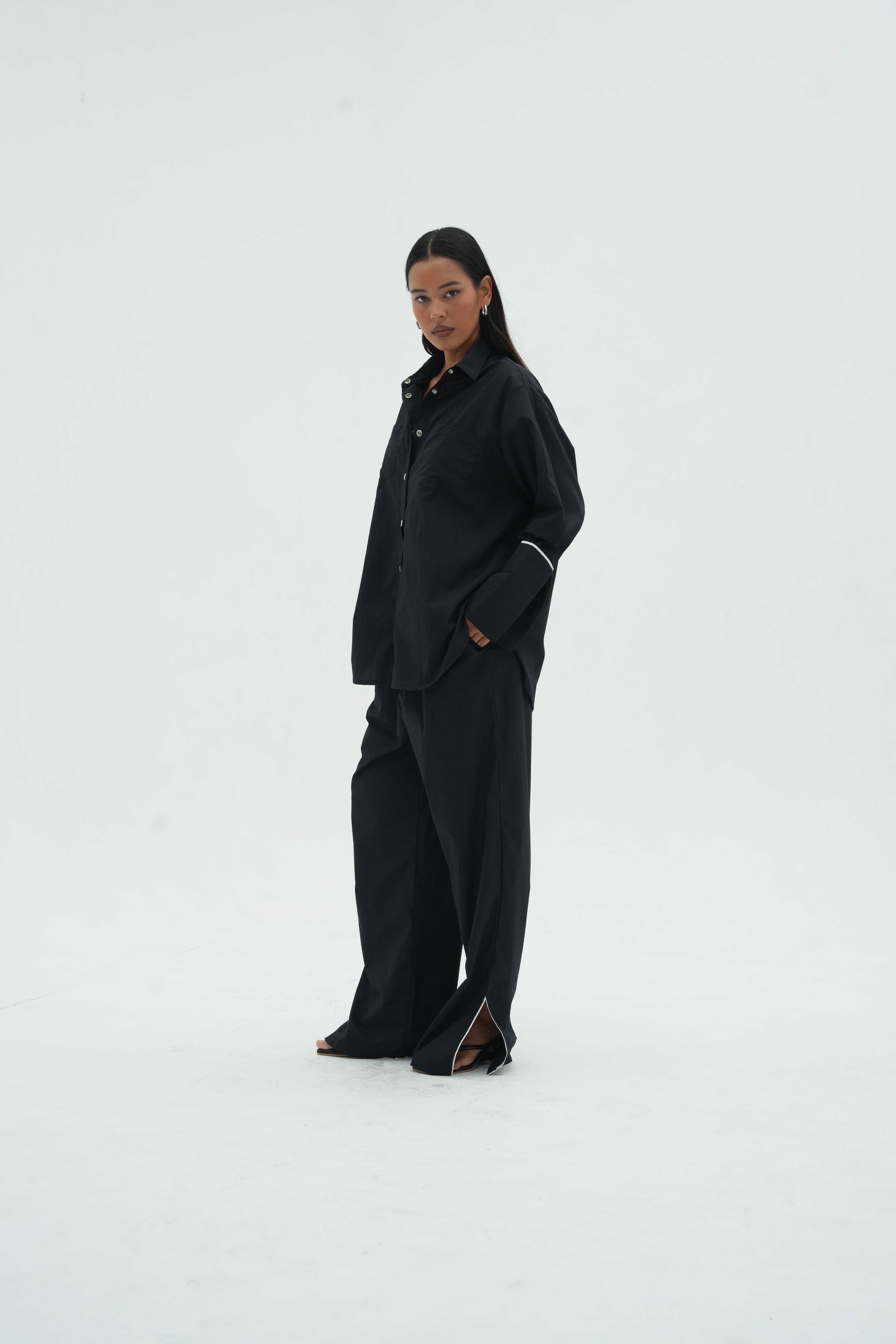The Dre Pant is crafted for subtle statement everyday wear. Crafted from a lightweight cotton poplin, these pants feature a thin drawstring waist, and exaggerated ankle side split with elevated ivory contrasting .