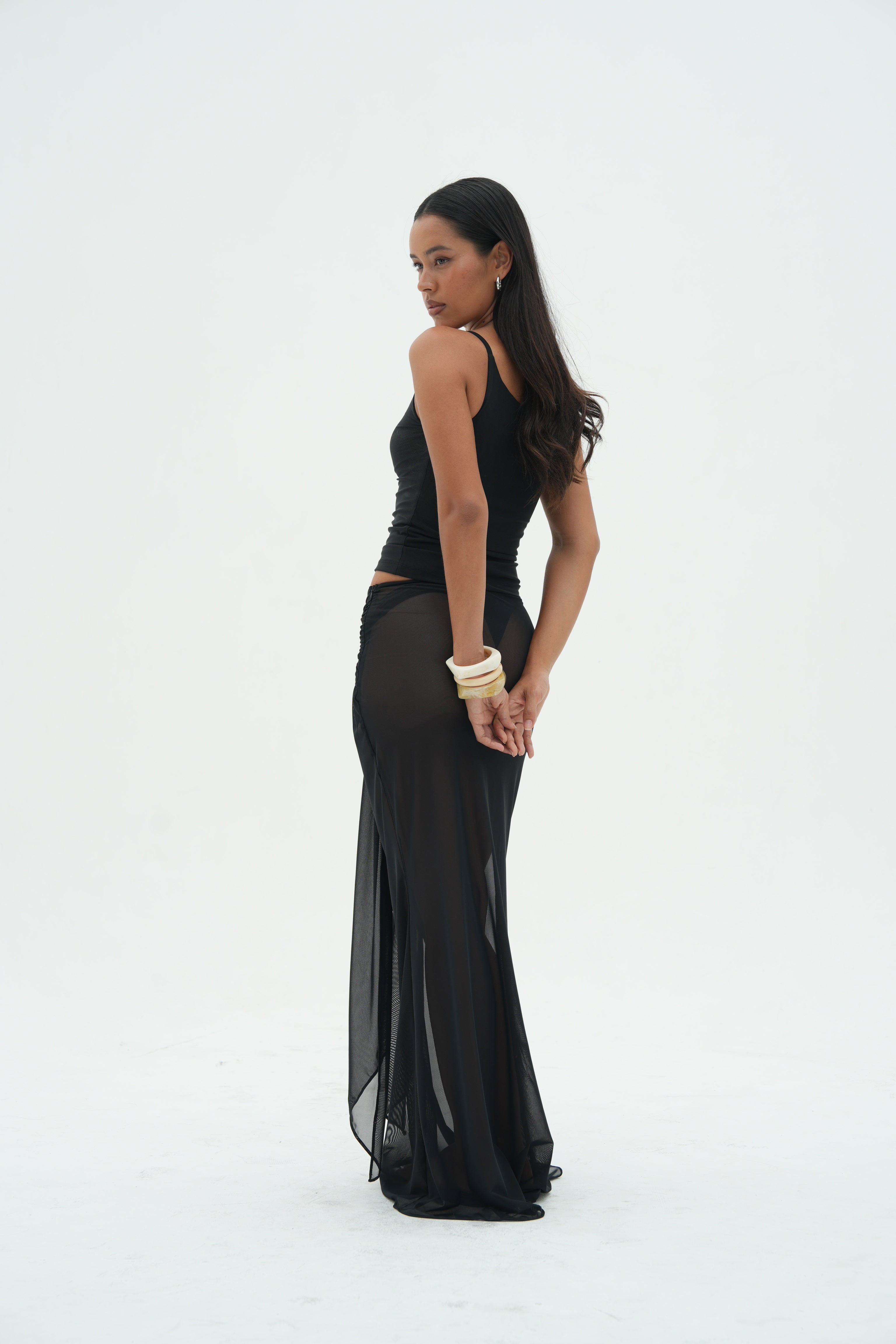 Make a statement in The Lucile Maxi Skirt, a floor length sheer design with a Lalu custom mother of pearl O ring. Featuring draped front panels for fluid movement. Crafted in a mesh stretch fabrication to move with you.