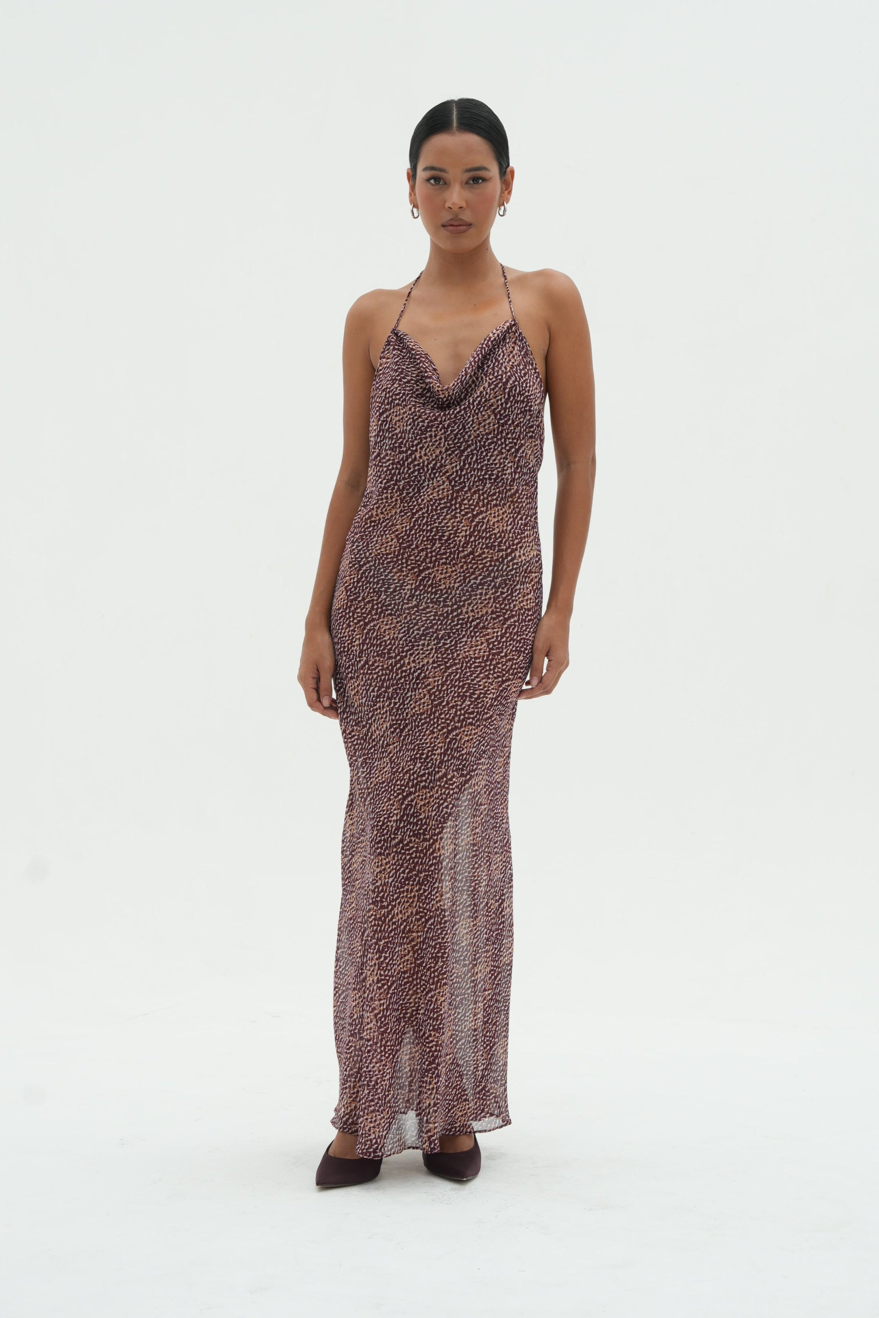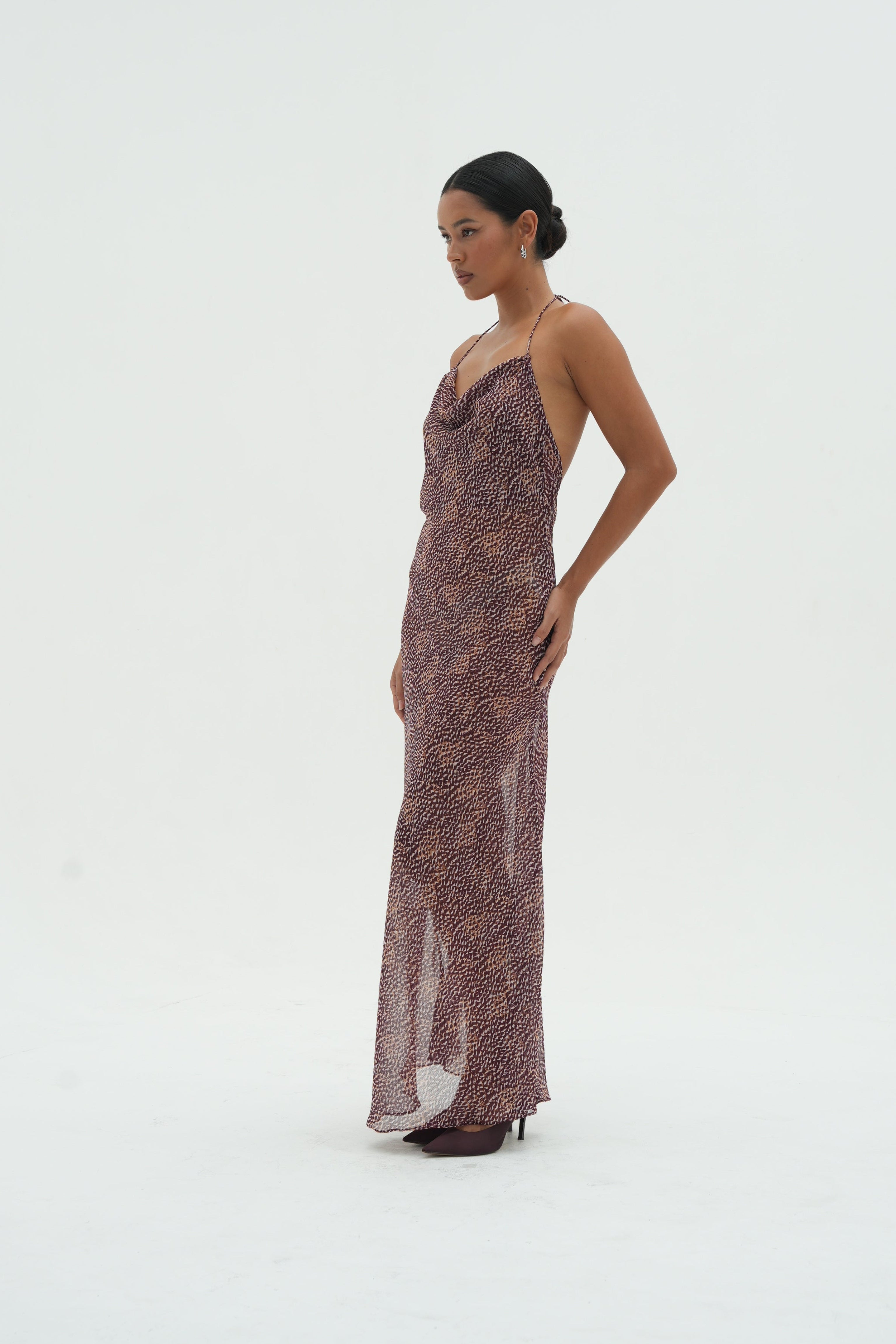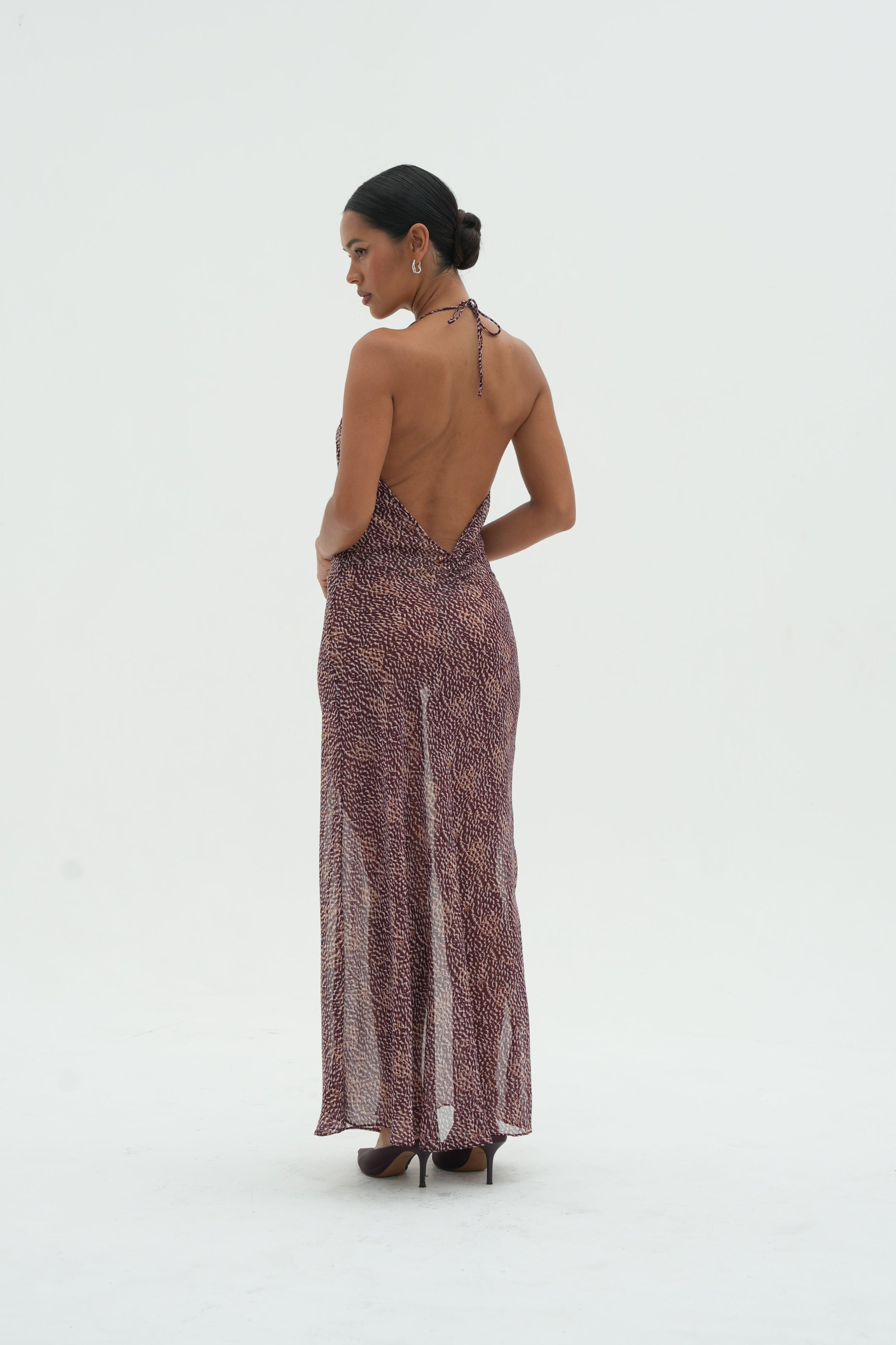 Drift though summer in The Roja Maxi Dress, crafted from lightweight, sheer silk chiffon, features our signature Bordeaux Marbella print. Cut on the bias for a flattering, flowing drape, this floor-length dress moves gracefully with every step. The low V cut rouched back allows an elegant statement from behind.